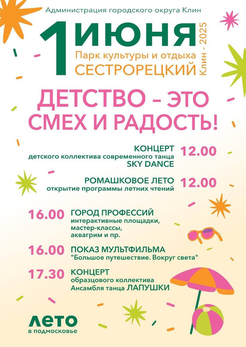 🤩🤩🤩🤩🤩 🎉👶 1️⃣ июня в Клину отметят День защиты детей 🪩💃 На сцене амфитеатра в 1️⃣2️⃣⏺️0️⃣0️⃣ начнётся концерт с участием студии хореографии «Sky Dance». В это же время пройдет открытие программы летних чтений «Ромашковое лето». 🎩🎬 В 1️⃣6️⃣⏺️0️⃣0️⃣ школьники и дошкольники смогут посмотреть под открытым небом мультфильм «Большое путешествие. Вокруг света». 👮♂️👩⚕️ С 1️⃣6️⃣⏺️0️⃣0️⃣ - «Город профессий». На интерактивных площадках девчонки и мальчишки смогут поближе познакомиться со снаряжением и приемам работы полицейских, спасателей, медиков и других классных специалистов. 🎙🎭 С 1️⃣6️⃣⏺️0️⃣0️⃣ на дорожках Сестрорецкого парка - интерактивные площадки и творческие мастер-классы, аквагрим и блеск-тату. 🕺🎶 В 1️⃣7️⃣⏺️3️⃣0️⃣ на сцену выйдут юные танцоры из Образцового ансамбля танца «Лапушки»! 💙🤩🤩🤩🤩🤩 МОЛОДЕЖНОЕ ТВ #клин #клинзвучит #молодежноеТВ