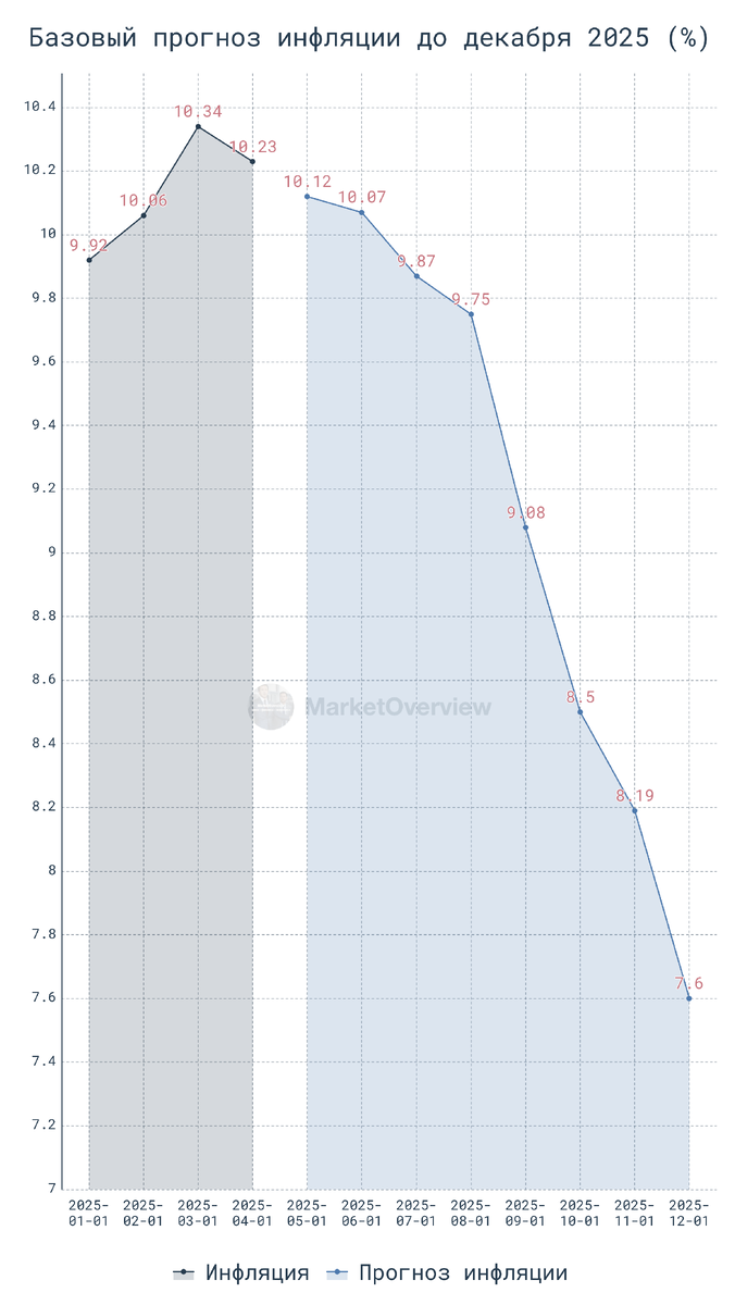 Министр экономического развития Максим Решетников предупредил о рисках переохлаждения российской экономики: В последнее время у нас недельные данные от месячных не так сильно отличаются, колебания не столь большие, иногда в плюс, иногда в минус, поэтому мы рассчитываем, что майские данные у нас эту тенденцию закрепят. Мы рассчитываем, что это своевременно будет учтено Центральным банком при принятии решений, потому что мы также видим в текущем режиме риски переохлаждения экономики. По расчетам Минэкономразвития годовая инфляция по псоледним недельным данным "укладывается в диапазон 3-4%" и это дает основания сохранить прогноз по инфляции на 2025 год на уровне 7,6%. Попробуем визуализировать как это может выглядеть. На графике базовый сценарий динамики инфляции по оценке модели с учётом сезонности и текущего тренда. Мы взяли данные инфляции за два года и спрогнозировали движение до декабря 2025 года, так чтобы инфляция сошлась к заявленной цели в 7,6%. ❗️ Важно: модель не учитывает но
