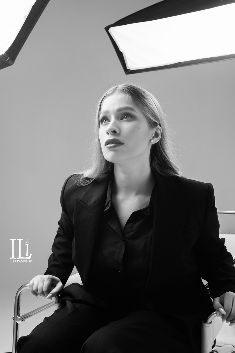 Обычно световое оборудование на съёмке – это то, что стараются скрыть. Лишние элементы, которые не должны попасть в кадр. Но в этот раз я решил сыграть наоборот: сделать техническую часть съёмочного процесса не только видимой, но и центральной частью визуального высказывания. Хромированные стойки, чёрные софтбоксы, кабели, колёса, конструкции – всё это стало фоном, архитектурой, декорацией на "сцене" студии. Белая циклорама подчёркивала графику, а минимализм пространства позволил сконцентрироваться на главном – на настроении, линии, взгляде. Всё здесь работает на контраст – свет и тень, металл и мягкий текстиль, чёрный костюм и белое кресло, прямые углы и расслабленная пластика тела. Модель, в похожем на мужской, чёрном костюме – как героиня вне времени. Это не просто костюм – это высказывание, переход от моды к роли, от образа к позиции. В чём-то кадры отсылают к эстетике модной съёмки 80-х. Она не позирует в классическом смысле – она занимает пространство. Сидит свободно, дерзко, с