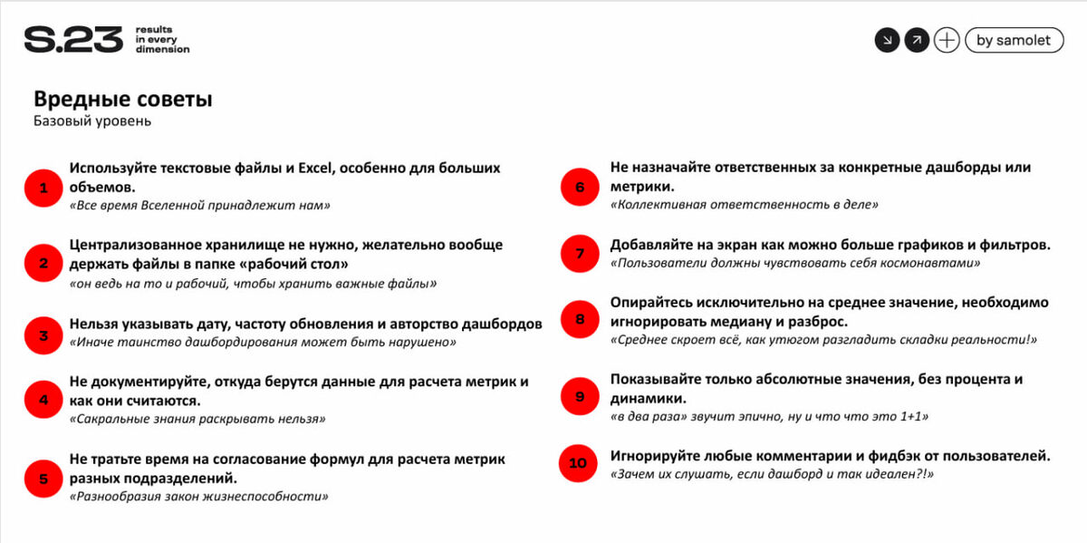 ... на скрине — как не надо, ниже — как надо. Смотрите, не перепутайте Александр Панькин, руководитель дирекции информационного моделирования S.23, Группа «Самолет», на BIM Просвете рассказал о том, как строить правильные BI-процессы, чтобы аналитика была эффективной. Профессиональные инструменты: используйте базы данных, витрины и подключение по API вместо выгрузок Excel и тестовых файлов для больших объемов данных. Централизация данных: организуйте централизованное защищенное хранилище данных вместо хранения файлов в случайных местах. Прозрачность дашбордов: указывайте дату обновления, частоту и автора дашборда. Так коллеги будут знать, насколько актуальные данные использованы. Документируйте, откуда берете данные и как их считаете. Согласуйте все метрики с бизнес-пользователями. Если этого не сделать — получите красивые цифры, в которые никто не будет верить, а значит, и отчёты не будут смотреть. Ответственность: у каждого дашборда должен быть владелец, который отвечает за его актуа