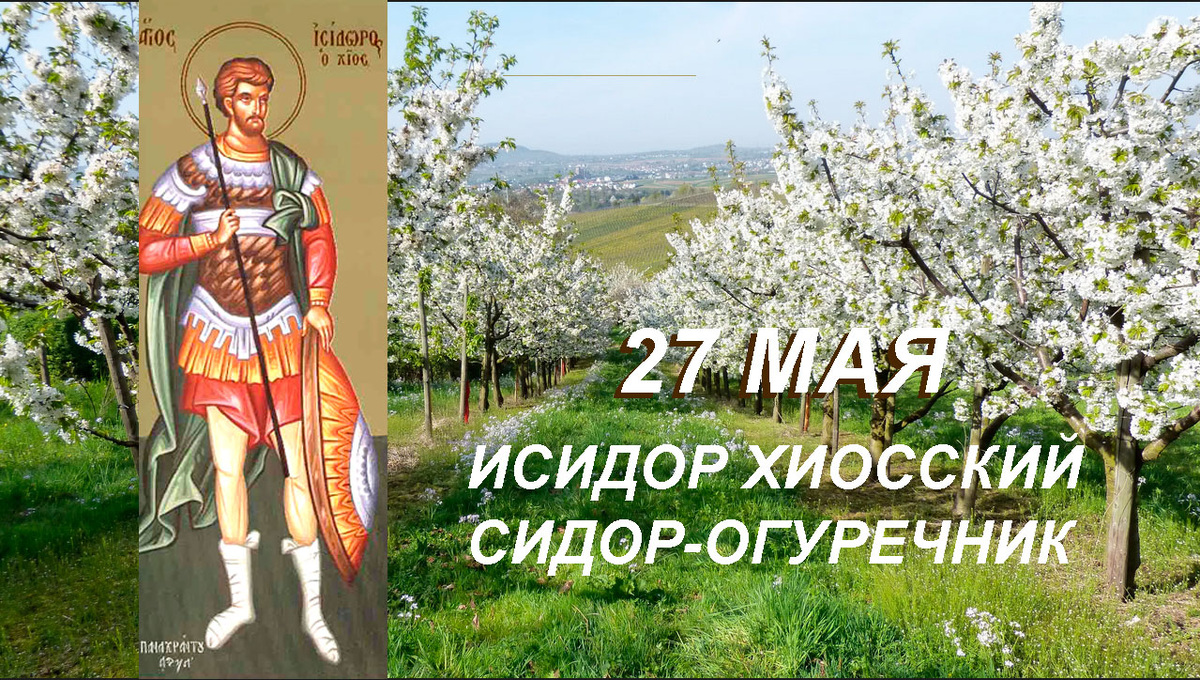 Исидор Хиосский — святой православной церкви, память которого отмечается ежегодно 27 мая. Исидор жил во времена правления императора Декия (Деция), в конце III века н.э., и пострадал за веру Христову. В народе в этот день известен как Сидор-огуречник. Память 27 (14) мая Исидор родился в городе Александрии в Египте. Затем он был призван на военную службу на о. Хиос в Эгейском море и стал опционом (т.е. унтер-офицером). В царствование императора Декия (Деция) вышел указ с требованием, чтобы все воины-христиане совершали поклонение римским языческим идолам. Исидор же не выполнял приказа и по доносу был приведен к военачальнику Нумерию. На все увещевания поклониться идолам, он отвечал отказом. За это был подвергнут страшным истязаниям. Когда ему отрезали язык, чтобы он не хулил языческих богов и не прославлял Христа, то и тогда он продолжал говорить членораздельно. Увидев такое чудо, Нумерий сам лишился дара речи и только и смог написать, чтобы Исидора усекли мечом. После этого тело святог