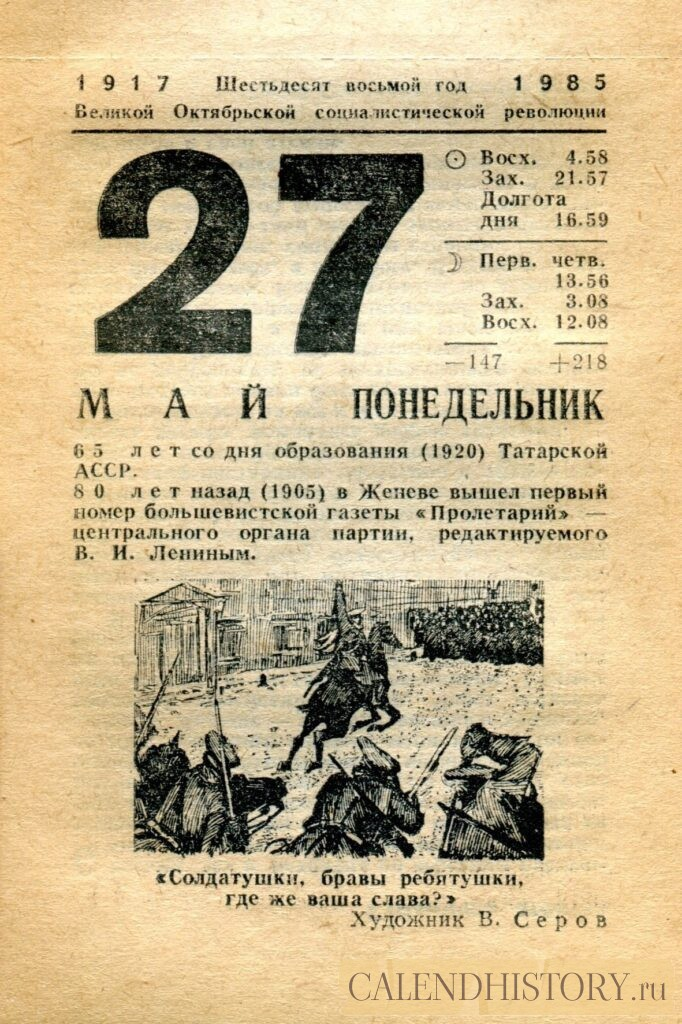 Итак, сегодня 27-го мая и у нас на календаре 1985-й год. Перед нами листок советского календаря для женщин. На календаре у нас понедельник - 27 мая 1985-го года. 65 лет со дня образования (1920) Татарской АССР. 80 лет назад (1905) в Женеве вышел первый номер большевистской газеты «Пролетарий» — центрального органа партии, редактируемого В. И. Лениным. «Солдатушки, бравы ребятушки, где же ваша слава?»