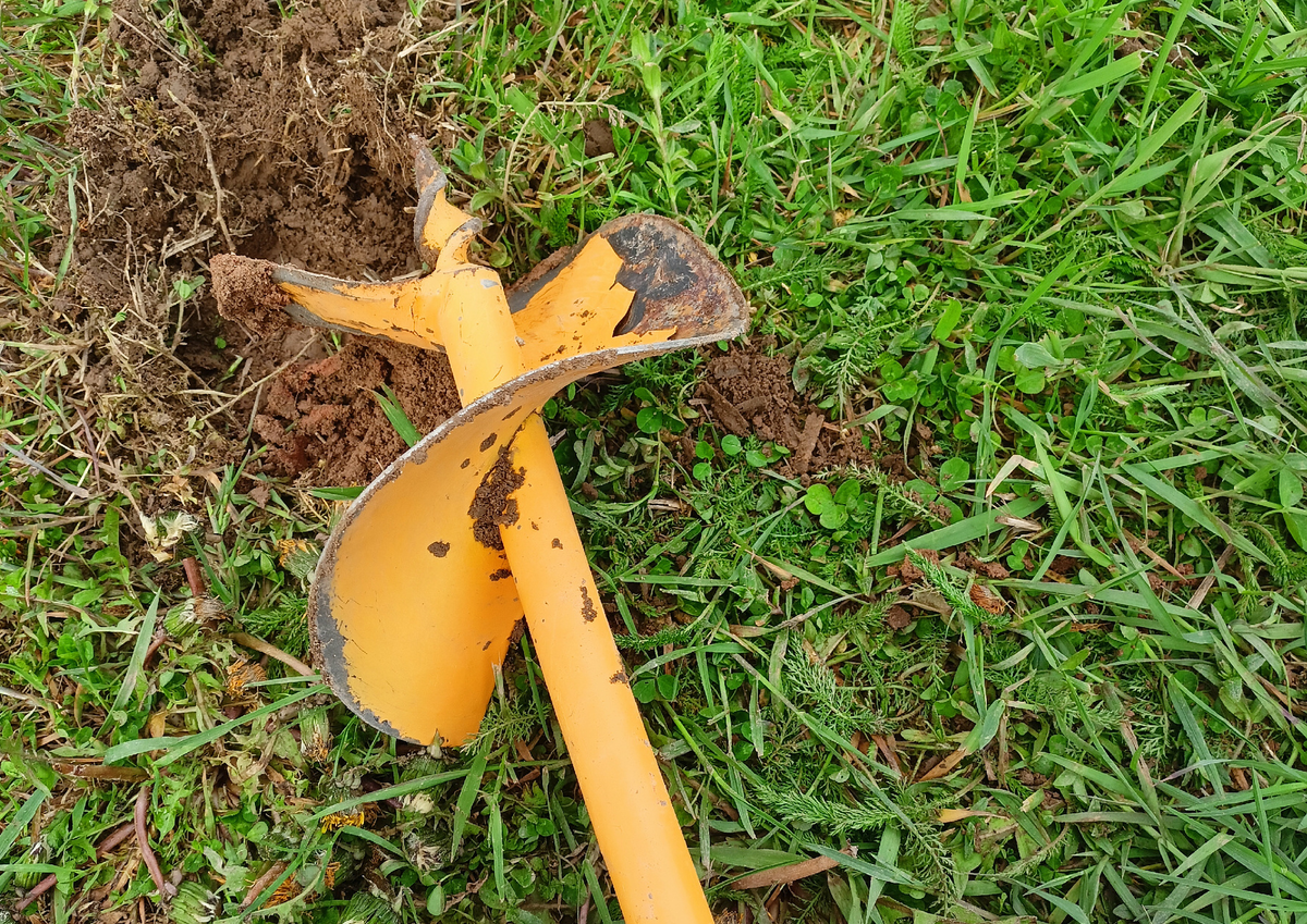 Сначала при бурении я столкнулся с очень плотной глиной. Но каково же было моё удивление, когда в нескольких отмеченных местах, не дойдя и до 50 см, я упёрся в твёрдую известняковую плиту. Такого расстояния было крайней недостаточно для надежной установки столбов.