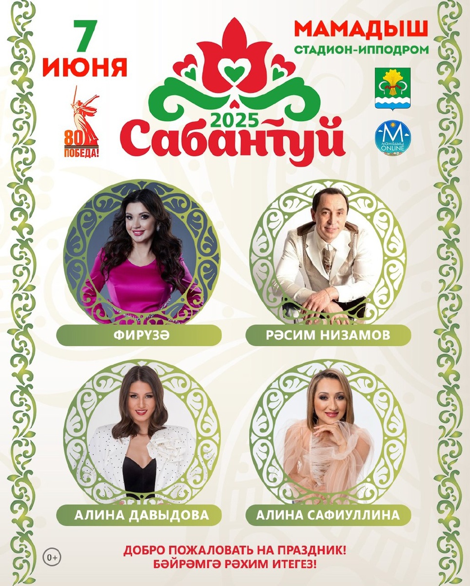 7 июня 2025 года в Мамадыше на стадионе-ипподроме пройдёт любимый всеми народный праздник — Сабантуй-2025! В этом году гостей ждёт не только весёлые игры, вкусная еда и народные забавы, но и яркий концерт с участием звёзд татарской эстрады! 🎤 На сцене выступят: — Фирүзә; — Рәсим Низамов; — Алина Давыдова; — Алина Сафиуллина. 📍 г. Мамадыш, стадион-ипподром 📅 7 июня 2025 года 🎉 Вход свободный Бәйрәмгә рәхим итегез! Добро пожаловать на праздник! ✅ ПОДПИСАТЬСЯ l ПРИСЛАТЬ НОВОСТЬ