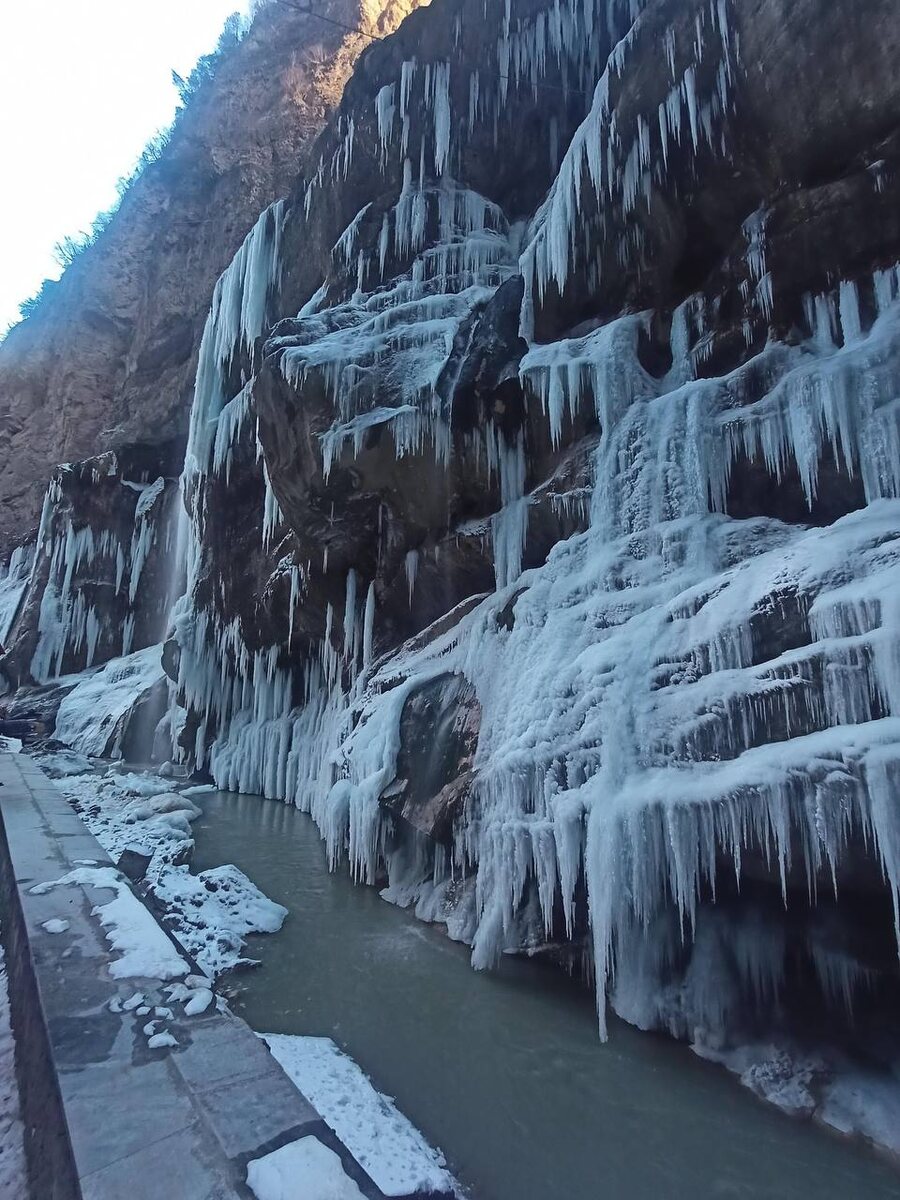 Кабардино Балкария. Чегемское ущелье и его фантастические по красоте Чегемские водопады. Глубина ущелья составляет 300 метров, оно протянулось более чем на 80 километров, а по его дну бежит река Чегем. Водопады стоитувидеть во все времена года. Мы побывали на них пока только зимой. И в это время года удивительная по своей красоте панорама зимнего Чегемского ущелья сравнима с дворцом Снежной королевы.🤴👑