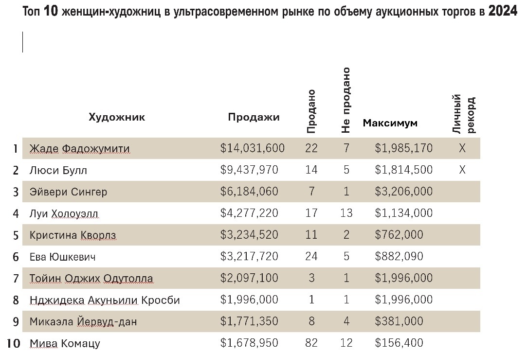 Верхняя десятка продала картин на 59 миллионов долларов, что представляет 40% всего ультрасовременного рынка. Времена кардинально меняются, и