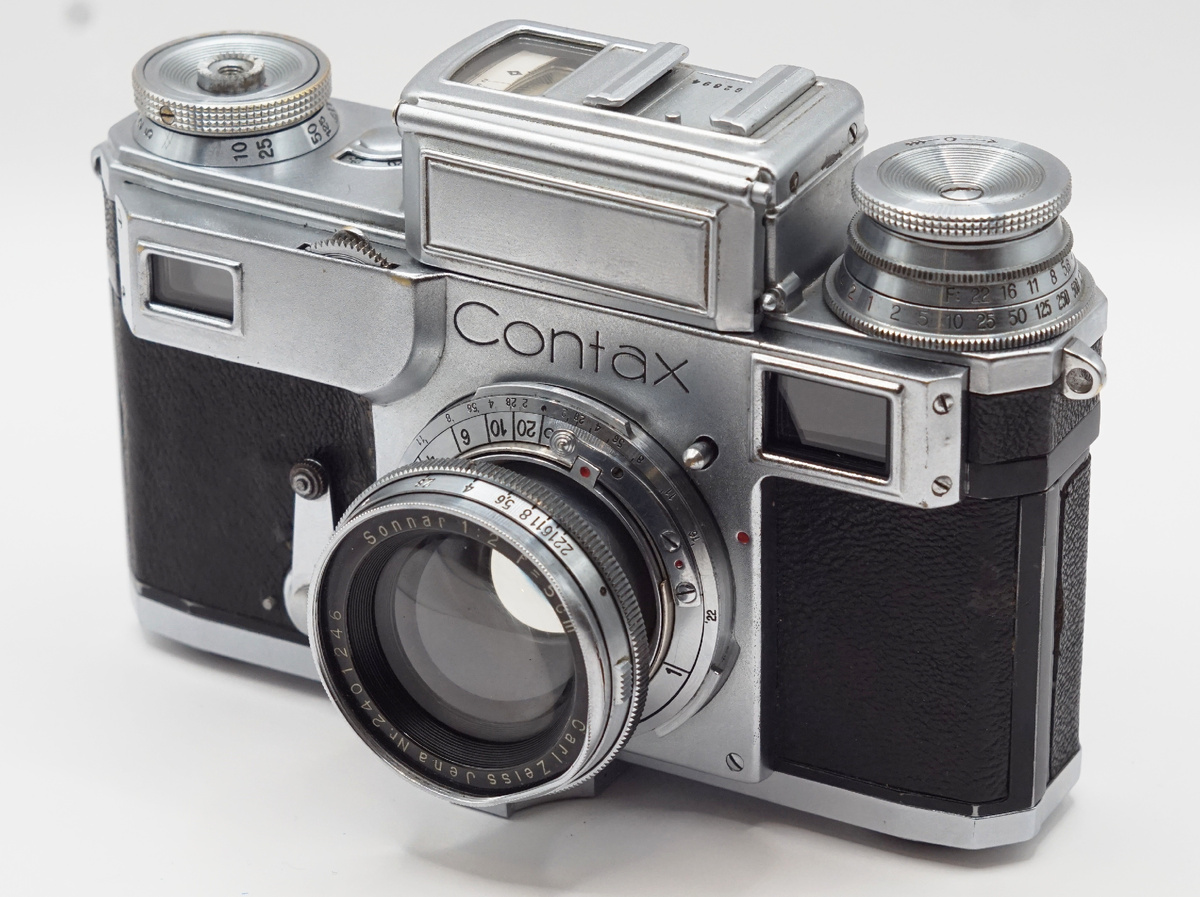 Этот аппарат производился в Германии компанией Zeiss Ikon где-то года с 1936-го, и, так полагаю, вплоть до Второй Мировой Войны. Задумывался он как конкурент легендарной Leica II. Фотоаппарат для своего времени был высококлассным, с точнейшим дальномером, совмещенным с видоискателем (начиная с моделей II и III), байонетным креплением оптики, полным диапазоном выдержек (с 1/2с до 1/1250с) и с обилием производившихся к нему аксессуаров и сменных объективов. Кратчайшая выдержка для 30-х годов прошлого века была почти рекордсменом, правда, при достаточно низкой светочувствительности пленок тех лет ее наличие не выглядит необходимым. Конструкция Contax во всем отлична от конкурентной Leica. У последней шторки двигаются горизонтально и изготовлены из прорезиненной ткани, у Сontax – вертикально и они представляют из себя латунные жалюзи, у Leica пленка на приемную катушку наматывается эмульсией наружу, у Contax – эмульсией внутрь, у Leica геликоид объектива вращается против часовой стрелки (если смотреть на аппарат со стороны объектива), у Contax – по часовой, и так далее. Основной причиной этих отличий является тот факт, что создатели Leica патентовали отдельные конструкторские решения, и, обходя эти патенты, у инженеров Zeiss Ikon получился такой аппарат.