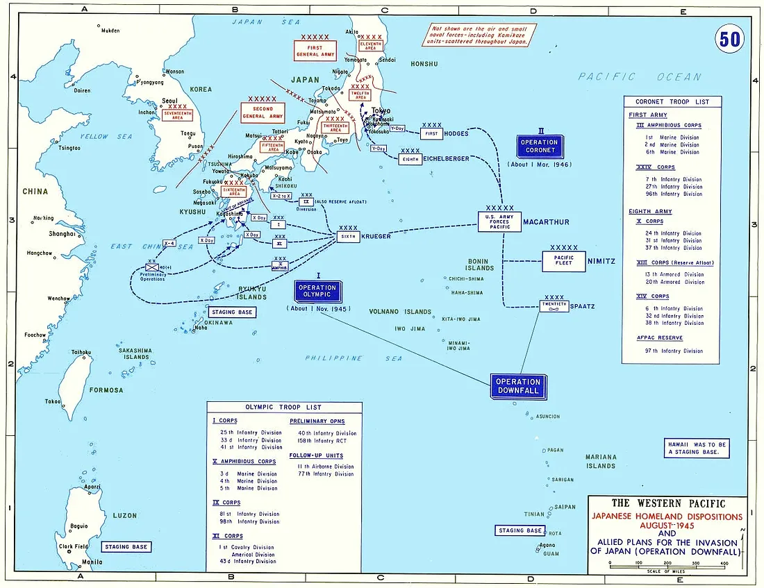 Первая фаза плана, названная «Олимпик», предусматривала захват Кюсю. Вторая фаза — «Коронет» — включала полномасштабное вторжение в кантоскую равнину в районе Токио и пленение императора. Весь план представлял собой огромную головную боль. Проблемы были не только в логистике, но и в геополитике.