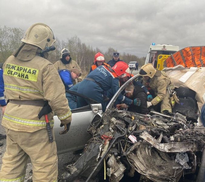 По данным МЧС, там столкнулись Toyota Caldina и «КАМАЗ».