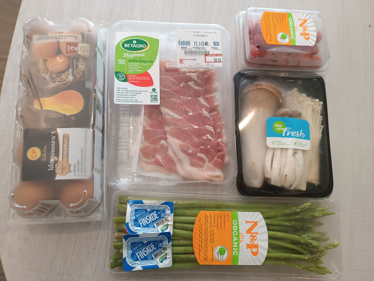 Здравствуйте, дорогие друзья! Сейчас мы находимся в Паттайе. Сначала мы жили в кондоминиуме с кухней, поэтому я не удержалась и решила приготовить необычный завтрак. Для этого в супермаркете Биг-С мы купили набор из различных грибов, бекон, яйца и спаржу. Сливочное масло мы не покупали, у меня оно осталась после завтрака в самолёте. У спаржи удалила более плотную часть стеблей, разрезала пополам и отварила в подсоленной воде 1 минуту. Спаржу поместила в миску с холодной водой для более быстрого остывания. В наборе было 3 вида грибов: эринги(самый большой) , эноки и что-то типа опят, их название я не знаю. Грибы я помыла, крупный разрезала вдоль, эринги разделила на более тонкие пучки. Затем обернула каждый кусочек беконом, посолила и поперчила. Обжарила грибы с беконом с разных сторон до зарумянивания бекона. 4 яица разбила в миску, посолила и тщательно перемешала. Яичной массой залила грибы с беконом и убавила огонь до минимума. Как только одна сторона поджарилась, с помощью т
