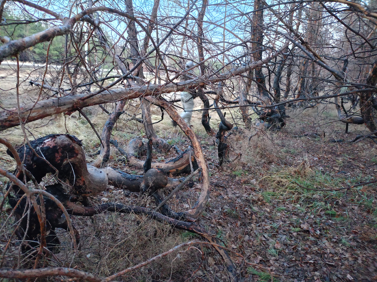 Происхождение, вероятнее всего, следует связать с большим отложением снега, который ломал ветви и изгибал стволики молодых сосен. Деревья не уступают в причудливости знаменитый «танцующий лес» в Калининградской области на Куршской косе. К сожалению, встречаются люди, которые небрежно относятся к природным богатствам и труду других людей. Вот и такое удивительное насаждение выгорело и вполне вероятно по причине устраиваемых палов сухой травы. К счастью, всё же сохранились деревья, не затронутые огнём.