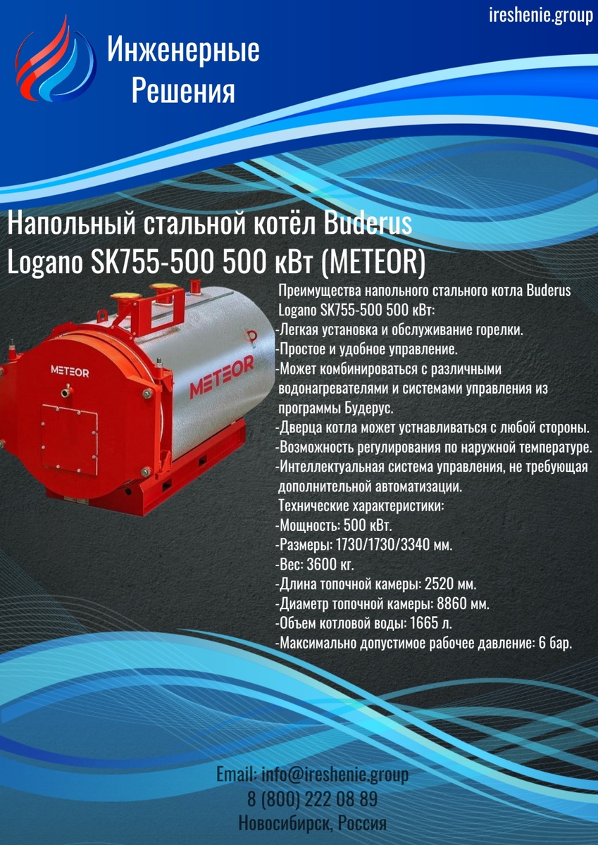 Напольный стальной котёл Buderus Logano SK755-500 мощностью 500 кВт предназначен для промышленного и коммерческого использования. Модель MeteoR представляет собой высокоэффективное устройство, предназначенное для крупных производственных объектов, административных зданий, спортивных комплексов и иных учреждений с большой площадью обогрева.