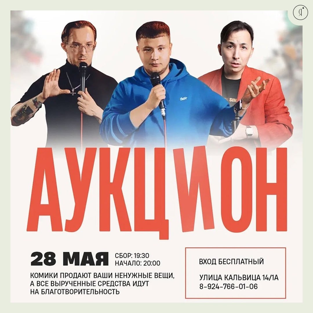 Аукцион #Вечером Новое комедийное шоу, где комики устраивают аукцион и продают ваши ненужные вещи. Это новый формат, поэтому нам очень нужны зрители и ваше барахло. Не упустите возможность провести время весело и попробовать что-то новенькое! 28 мая | 20:00 Крыша, Кальвица, 14/1а Бронирование столов: +79247660106 Online Якутия | Подписаться