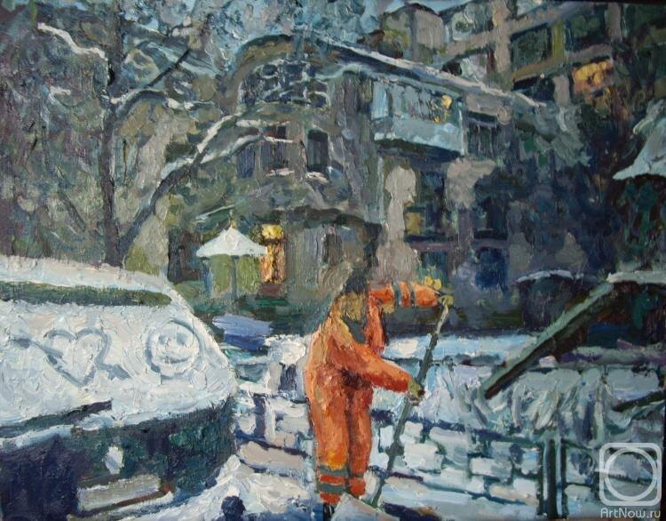 Зима. Светает. Дворник в оранжевом комбенизоне вышел на работу… Пастозно, размашисто, свободно…