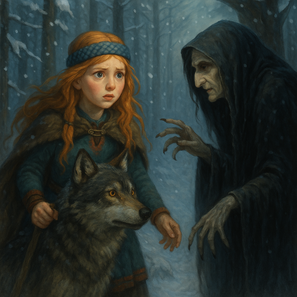 В одном северном краю, где сосны тянутся к небу, как копья викингов, а снег лежит так долго, что дети растут, не зная травы, жила девочка по имени Сигна. У неё был младший брат — Хальвар. Весёлый, шумный, немного упрямый, но добрый мальчишка. Они были неразлучны. Вместе бегали по льду, слушали сказки у костра и прятались от бурь в старом бревенчатом сарае. Всё изменилось в один день. На деревенскую ярмарку пришла странная женщина — высокая, в чёрном плаще, с глазами цвета замёрзшего озера. Она торговала тряпичными куклами, чучелами из соломы и ожерельями из кости. Хальвар подошёл посмотреть на куклу с волчьей мордой — и женщина наклонилась к нему, шепнула что-то. Через секунду его тело окутал чёрный дым — и на месте мальчика стоял волк. — Он больше не человек, — сказала ведьма. — Хочешь вернуть брата — найди меня. Если осмелишься. Она исчезла, как растаявший иней. А Сигна осталась одна — с волком, в чьих глазах горел знакомый огонёк. Прошло три года. Сигна и волк прошли ледяные реки,