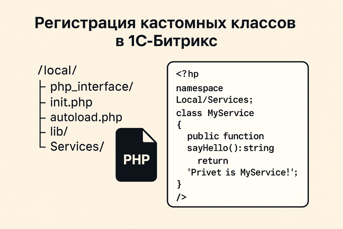 PSR-4 β ΡΡΠΎ ΡΡΠ°Π½Π΄Π°ΡΡ, ΠΎΠΏΠΈΡΡΠ²Π°ΡΡΠΈΠΉ, ΠΊΠ°ΠΊ ΠΊΠ»Π°ΡΡΡ Π΄ΠΎΠ»ΠΆΠ½Ρ Π±ΡΡΡ ΡΠ²ΡΠ·Π°Π½Ρ Ρ ΡΠ°ΠΉΠ»ΠΎΠ²ΠΎΠΉ ΡΠΈΡΡΠ΅ΠΌΠΎΠΉ. ΠΠ°ΠΏΡΠΈΠΌΠ΅Ρ: Π‘ΠΎΠ·Π΄Π°ΡΠΌ ΡΠ°ΠΊΡΡ ΡΡΡΡΠΊΡΡΡΡ ΡΠ°ΠΉΠ»ΠΎΠ² ΠΈ ΠΏΠ°ΠΏΠΎΠΊ: Π€Π°ΠΉΠ»: /local/php_interface/lib/Services/MyService.php ΠΠ±ΡΠ°ΡΠΈΡΠ΅ Π²Π½ΠΈΠΌΠ°Π½ΠΈΠ΅: Π€Π°ΠΉΠ»: /local/php_interface/autoload.php Bitrix Π°Π²ΡΠΎΠΌΠ°ΡΠΈΡΠ΅ΡΠΊΠΈ ΠΏΠΎΠ΄ΠΊΠ»ΡΡΠ°Π΅Ρ /local/php_interface/init.php ΠΏΡΠΈ Π·Π°ΠΏΡΡΠΊΠ΅. ΠΠΎΠ±Π°Π²ΠΈΠΌ ΡΡΠ΄Π°: Π’Π΅ΠΏΠ΅ΡΡ ΠΌΡ ΠΌΠΎΠΆΠ΅ΠΌ ΠΈΡΠΏΠΎΠ»ΡΠ·ΠΎΠ²Π°ΡΡ ΠΊΠ»Π°ΡΡ Π² Π»ΡΠ±ΠΎΠΌ ΠΌΠ΅ΡΡΠ΅, Π½Π°ΠΏΡΠΈΠΌΠ΅Ρ, Π² ΡΠ°Π±Π»ΠΎΠ½Π΅ ΠΊΠΎΠΌΠΏΠΎΠ½Π΅Π½ΡΠ° ΠΈΠ»ΠΈ Π² Π΄ΡΡΠ³ΠΎΠΌ ΠΊΠ»Π°ΡΡΠ΅: ΠΠ»Ρ ΠΏΡΠΎΠ²Π΅ΡΠΊΠΈ, Π·Π°Π³ΡΡΠΆΠ°Π΅ΡΡΡ Π»ΠΈ ΠΊΠ»Π°ΡΡ: ΠΡΠ»ΠΈ Π²Ρ ΠΏΠΈΡΠ΅ΡΠ΅ Bitrix-ΠΌΠΎΠ΄ΡΠ»Ρ, ΠΈΡΠΏΠΎΠ»ΡΠ·ΡΠΉΡΠ΅ Π²ΡΡΡΠΎΠ΅Π½Π½ΡΠΉ ΠΌΠ΅ΡΠΎΠ΄ ΡΠ΅Π³ΠΈΡΡΡΠ°ΡΠΈΠΈ: Π composer.json: ΠΠΎΡΠ»Π΅ ΡΡΠΎΠ³ΠΎ: Class not found. ΠΡΠΎΠ²Π΅ΡΡΡΠ΅ ΠΏΡΡΡ, namespace ΠΈ ΠΈΠΌΡ ΡΠ°ΠΉΠ»Π°
