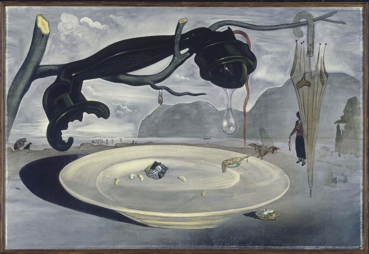 Знакомьтесь с художником: Дали. Загадка Гитлера. Картина написана 1938 году в тёмных газетных тонах, в светлой глиняной тарелке лежит небольшой рваный фрагмент фотографии Адольфа Гитлера. Под телефоном стоит пустая тарелка, на которой лежит несколько бобов, как известно уже, символ ужаса войны и бедноты. Фюрер загадочен и выглядит очень плохо, как будто предчувствует свою скорую гибель. От его вида стошнило летучую мышь. Над тарелкой недавно обрубленная ветка чёрного дерева, на котором повисли трубка телефона и прозрачный зонт. Зонт принадлежит Чемберлену. Вдали в воде стоит группа людей в одежде, как символ уходящего мира. Слева под зонтом уместилась чёрная собака. Облака предсказывают плохую погоду. Все эти предметы, изображенные на картине, являются символами того, что мир не спасти, и война неизбежна, а все попытки и переговоры бесполезны перед надвигающейся катастрофой. Повторюсь, картина написана в 1939 году, когда Германия вторглась в Польшу. В июне 1941 года Гитлер отдал