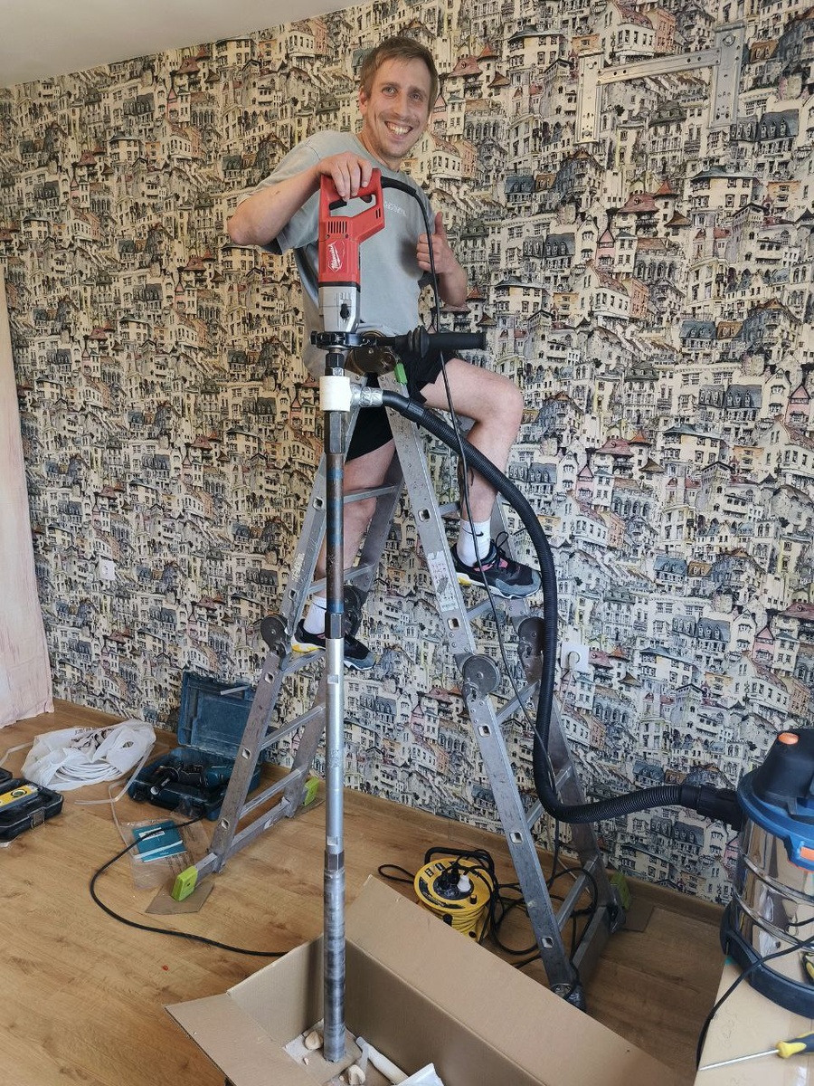 Александр и Артём — наши климатические Джедаи — взялись за дело. Стена оказалась не самой гостеприимной (без удлинителей трассы никак), но ребята справились как в лучших выпусках шоу «Сделано на совесть». Всё чётко, аккуратно и с уважением к штукатурке.