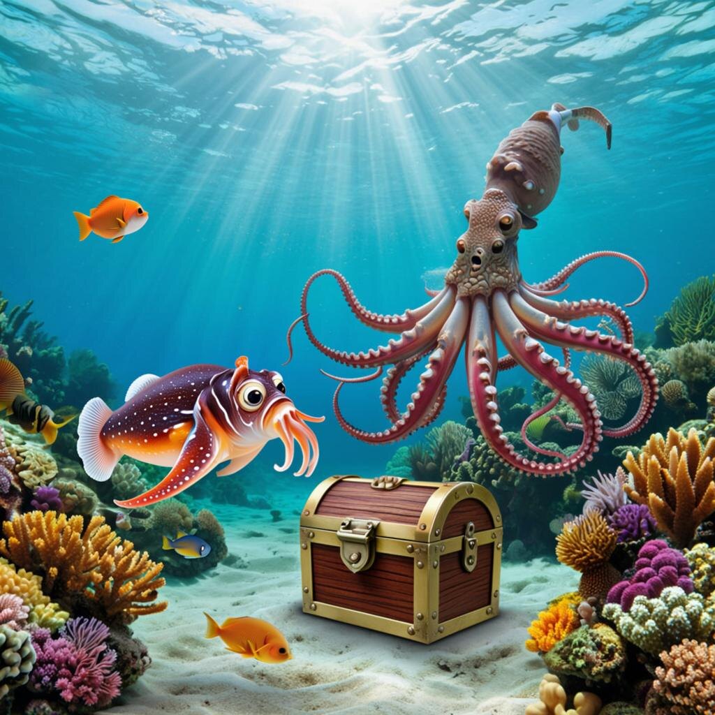 В глубинах Тихого океана жила одна особенная каракатица по имени Хитрюга. От других ее отличала способность менять форму тела и цвета кожи быстрее, чем любая другая каракатица. Именно поэтому местные жители называли ее Хитрюгой. Однажды, играя среди подводных камней, Хитрюга случайно натолкнулась на огромный сундук, покрытый водорослями и кораллами. Внутри лежали драгоценности невероятной красоты, украденные пиратским судном много веков назад. Хитрюге захотелось заполучить эти богатства, но она знала, что придется перехитрить местного стража – гигантского кальмара Охранителя Сокровищ. Тот был известен своей осторожностью и силой. Хитрюга решила притвориться медузой и спокойно проплыла мимо Охранителя. Затем, превратившись в кусок камня, подобралась к сундуку. Наконец, приняв облик невидимой капли воды, открыла замок и схватила одну жемчужину. Однако Охранитель сразу раскусил обман. Решив наказать дерзкую воришку, он начал преследование. Но Хитрюга оказалась быстрее: превратилась в