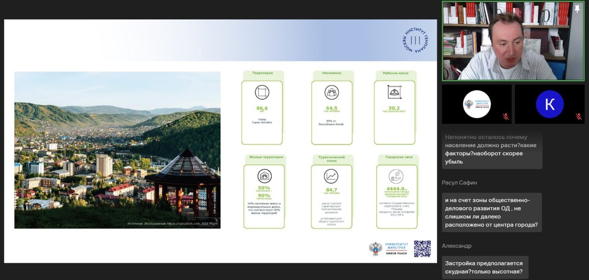 📢 ПРЯМОЕ ВКЛЮЧЕНИЕ С ГРАДОСТРОИТЕЛЬНОЙ НЕДЕЛИ: ДЕНЬ 2 — ИНТЕРАКТИВНЫЙ СЕМИНАР «ПРОЕКТНЫЕ РЕШЕНИЯ ДЛЯ ТЕРРИТОРИЙ» 📍 Щенин Никита Александрович — Начальник мастерской комплексного развития городских территорий Института Генплана Москвы 🎤 Цитата: «Особенность города Горно-Алтайск – нестандартная система расселения, когда в центре есть многоквартирные дома, а на периферии жилая застройка состоит из ИЖС, так же город является одним из самых «зеленых в стране». Это наложило свои ограничения на проектирование мастер-плана. В результате большой аналитической работы было предложено три возможных сценария развития: инерционный, самодостаточный и прогрессивный город. Каждый из сценариев подразумевает свои точки роста и развития. Так, в самодостаточном городе больший акцент сделан на создании транспортной составляющей, а в прогрессивном варианте – туристического кластера. При этом во всех сценариях учитывается и развитие профессионального образования, создание новых рабочих мест, реорганизаци