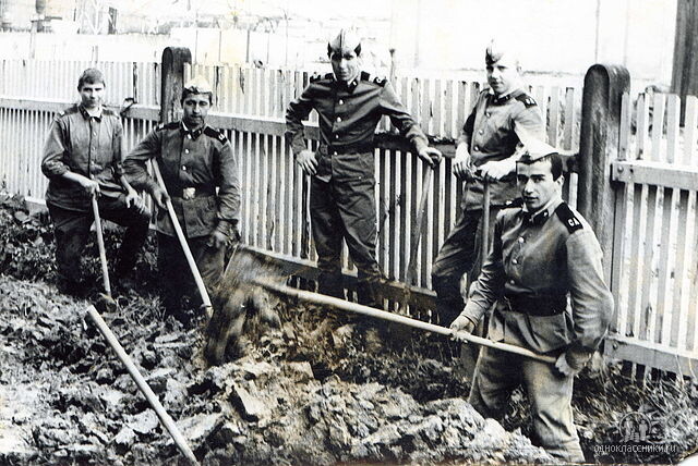 На фото - родной Взвод Управления Дивизионом в действии. Тот самый армейский экскаватор, бери больше, кидай дальше. Четверо с лопатами и сержант -экскаваторщик, очень кстати колоритная личность, помню что таких как он, было меньше чем самых редких зверюшек в Красной книге. По статье национальность был он из табасаранцев ( Табасаранцы — этническая группа Северо-Восточного Кавказа, проживающая преимущественно в южной части Северокавказской республики Дагестан.) было их тысяч пятьдесят на всю страну. Вот один нам достался, должен же кто -то издавать гортанные звуки и гонять стадо на физ -зарядку и приём пищи. Наш взвод был похож на пёстрое лоскутное одеяло и при численности в 30 человек в нём насчитывалось целых 16 национальностей, прямо Советский Союз в миниатюре.