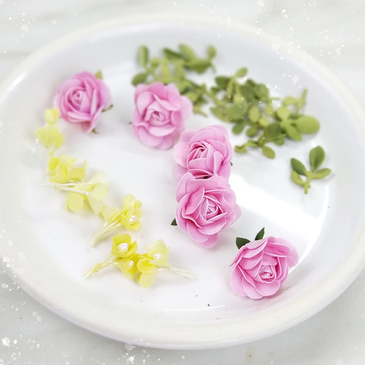 В этой статья я заканчиваю подготовку декора для цветочной заколки. Ранее вы могли видеть две публикации с процессом создания цветочков. Часть 1: небольшие розочки. Часть2: цветочные веточки. Сегодня займемся листочками из фоамирана. 1. Фоамиран оливкового цвета (классический), 2. Масляная пастель. 3. Обычная бумага для принтера)) Для своих листиков я выбрала классический фоамиран (1мм) оливкового цвета. Можно поэкспериментировать и выбрать другой оттенок зеленого. Накрываю фоамиран кусочком бумаги для принтера. Благодаря этому вырубка из фоамирана получается более четкой. С помощью фигурного дырокола начинаю вырубать листики. Дырокол делает веточки размером 2,5см Листики тонирую мягкой масляной пастелью темно-зеленого цвета. Можно затонировать листочки пастелью красно-коричневого цвета (тоже будет красиво). Для удобства наношу пастель на пальчики (на большой и указательный). Полностью листики не тонирую. Добавляю цвет не на всю поверхность листочков, а частично. Пастель наношу с дву