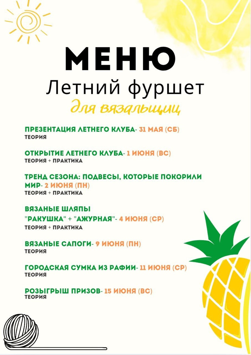 Летний фуршет для вязальщиц 🌞 Представьте: легкий летний вечер, приятная компания и… вязание! Да-да, мы совместим несовместимое и создадим что-то по-настоящему особенное 🎉Устроим настоящий праздник- с теплой атмосферой, полезными знаниями и, конечно, пряжей в руках. Еще и в онлайн-формате, чтобы присоединиться могла любая мастерица, даже если она далеко! ❌Никаких скучных вебинаров с водой и навязчивыми продажами Я сама терпеть не могу бесконечные "продающие" эфиры, после которых остается только разочарование о бессмысленно потраченном времени... ✔️Поэтому у меня будет иначе: каждая встреча- это море полезной теории и практики. Никакого обмана, только честность и ценность🤌🤌 Открытый доступ для всех! Все эфиры будут в основном Телеграм-канале, и присоединиться сможет кто угодно- приходите просто послушать, зарядиться идеями. А если после этого захотите вступить в клуб и вязать вместе с нами- двери всегда открыты!🚪 Лето- время ярких впечатлений! Давайте начнем его с чего-то по-