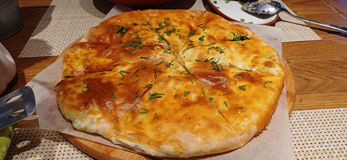 Ну, а огромный сочный осетинский пирог с сыром и картофелем мы вдвоем не смогли осилить за один раз, пришлось забирать с собой половину этой вкуснейшей выпечки в номер отеля.