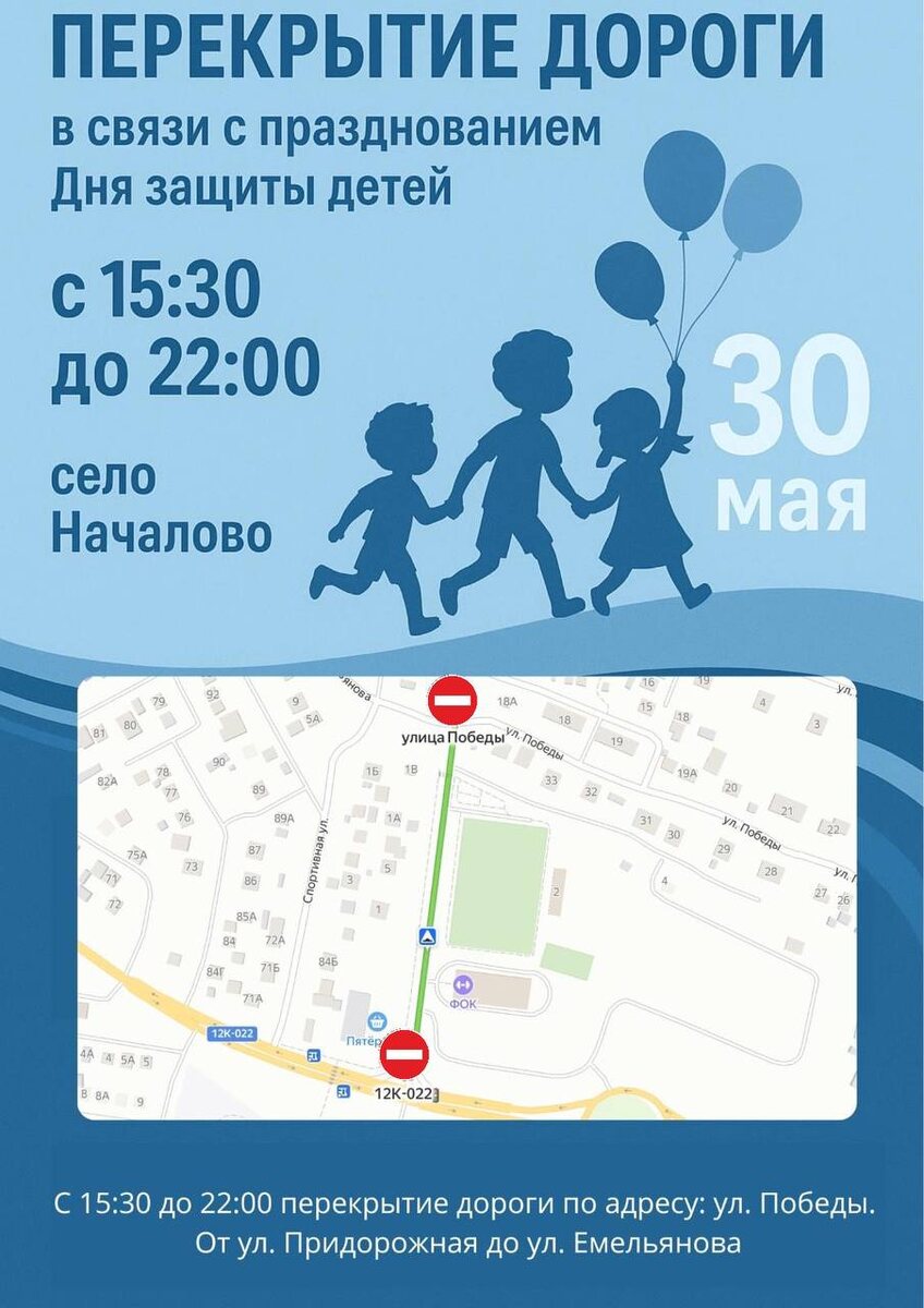 ‼️В связи с празднованием Дня защиты детей в селе Началово будет ограничено движение