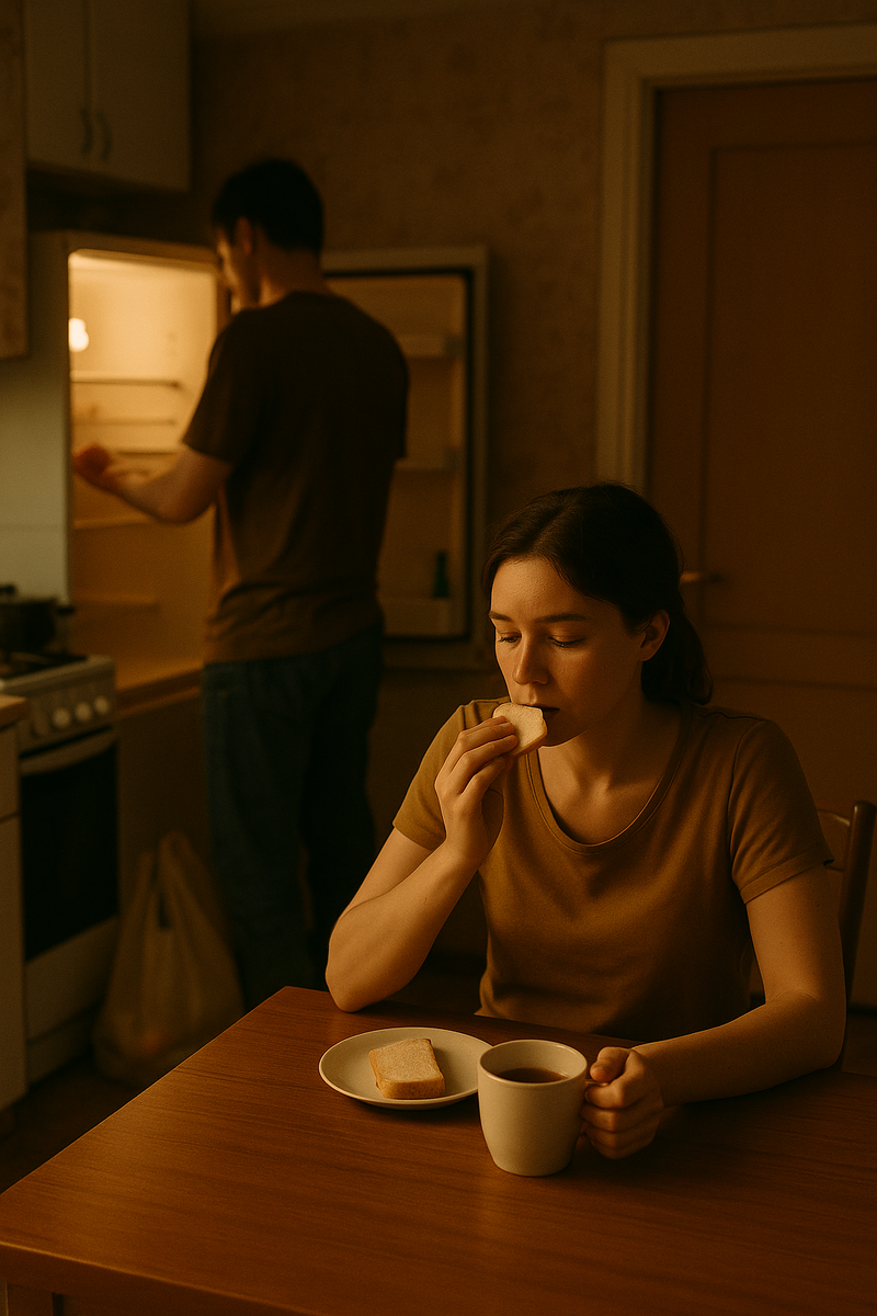 Она умела из этого делать «почти обед». Нагревала воду, нарезала лук, немного масла — и вот уже луковый суп с хрустящей гренкой. Муж ничего не замечал. Он приходил с работы, тёр руки: