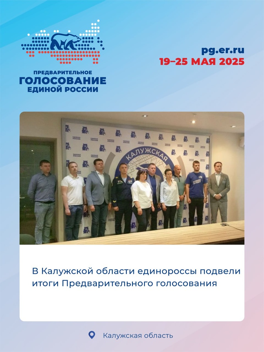 В регионе завершилось электронное предварительное голосование «Единой России». ✔️В предварительном голосовании "Единой России" по кандидатурам для последующего выдвижения от партии в депутаты Законодательного Собрания Калужской области приняло участие 243 кандидата из них 3 участника СВО. Средний конкурс составил 6 человек на место. Явка составила 8,56% (68321), для сравнения в 2020 году 5,83%, от общего количества избирателей региона. В отдельных муниципальных образованиях явка составила 101-106 % (Хвастовичский, Жиздринский, Барятинский). ✔️Также предварительное голосование состоялось в городе Калуга в Городскую Думу. Зарегистрировалось на сайте ПГ 160 кандидатов. Средний конкурс составил около 5 человек на место. Приняло участие 7,40% (21855), от общего количества избирателей. ✔️Предварительное голосование состоялось в городе Обнинске в Городское Собрание. Зарегистрировалось на сайте ПГ 90 кандидатов. Средний конкурс составил 3 человека на место. Приняло участие 6,89% (6421), от