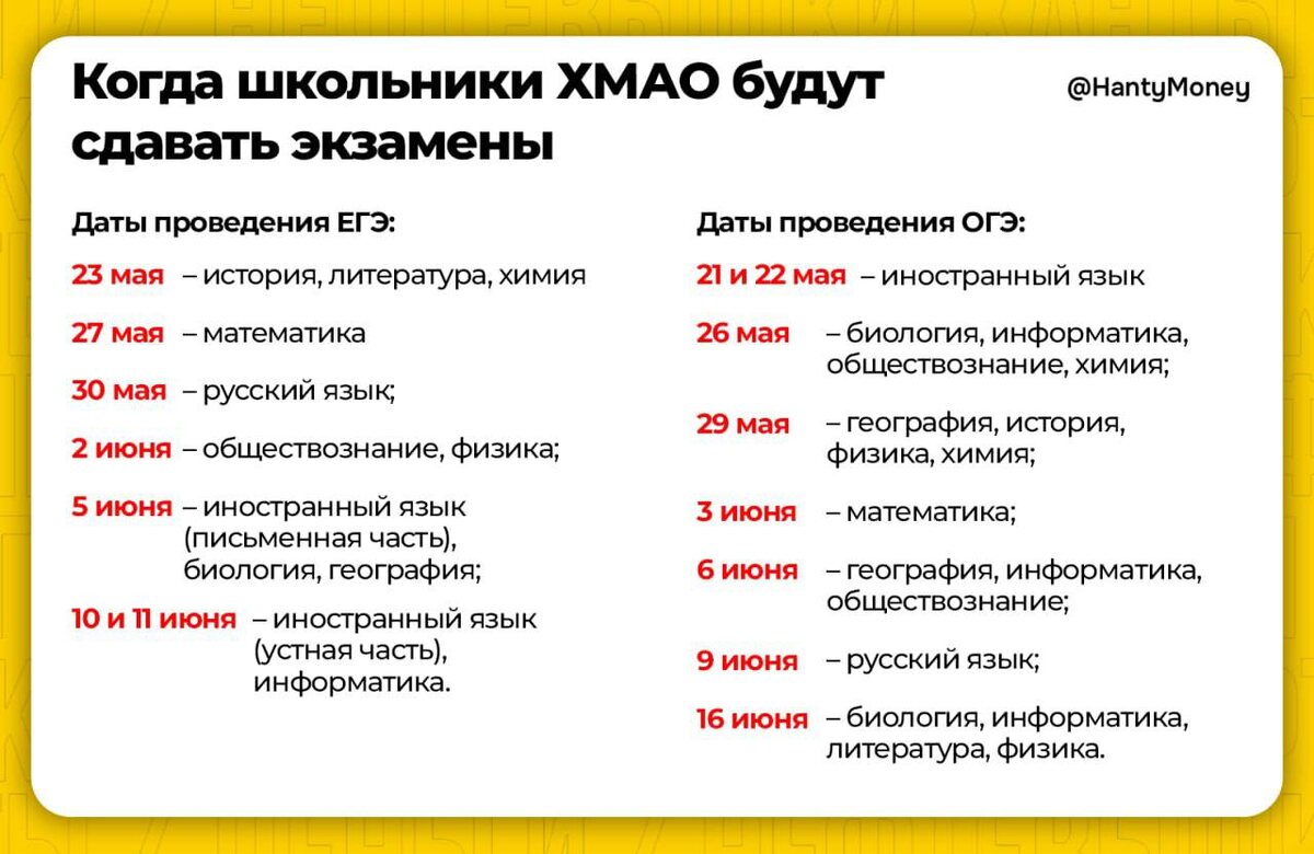 Даты ОГЭ и ЕГЭ в Югре Собрали все в одной карточке - смотрите даты. Два экзамена уже прошли. Всем выпускникам ни пуха, ни пера! 🍀 Подписаться | Прислать новость | Дать «буст»