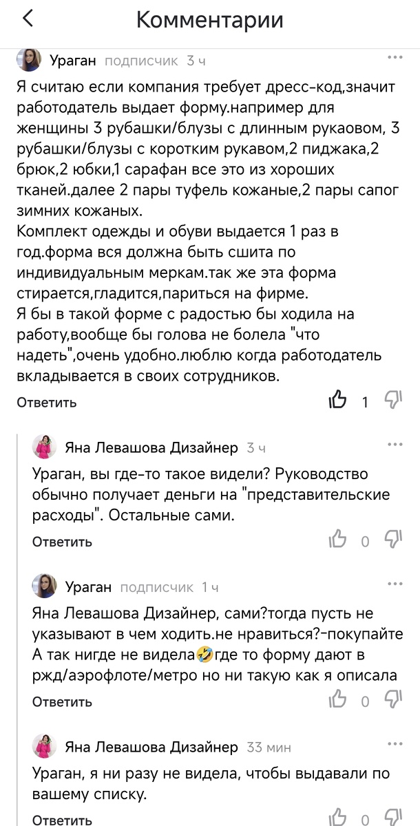 На все сезоны. Главное, чтобы это не была форменная одежда из дешевых синтетических материалов с лого компании, обувь "прощай молодость", а современные, актуальные и качественные вещи и хороших тканей. Но так, чтобы эти вещи и в повседневной жизни носить было комфортно, сшито всё было по меркам! Думаю, все уже догадались, откуда это всё :) Допустим, сбылась мечта девушки. Выбрали какую-то швейную фабрику с неплохим качеством или марку крупную с широким размерным рядом. В индпошив поверю только для руководящего состава, это долго и дорого. Сама шью на заказ, индивидуальный мастер одевает руководителей, но вот одеть все их отделы, управления, персонал в них физически не возможно. Вызывают сотрудников сначала на снятие мерок, под это ещё нужно выделить место и время в офисных буднях. Потом сшили и привезли одежду и обувь, скорее всего, разделив на несколько обобщенных размеров, а не с биркой по фамилии каждого сотрудника. И тут начинается! Одной размер не подходит, у другой требуется подг