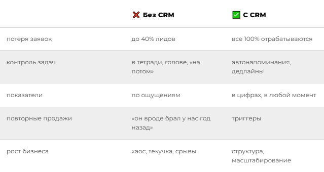 В мире бизнеса поддержание отношений с клиентами — ключ к успеху. Однако без CRM-системы менеджеры часто забывают о своих обязательствах перед клиентами. В результате клиенты уходят к конкурентам, так и не получив конкретных ответов и быстрого решения своей задачи. Без CRM менеджеры легко теряются: забывают детали, не отвечают вовремя, не перезванивают и упускают важные моменты. В результате клиент уходит к тем, кто работает быстрее и точнее.