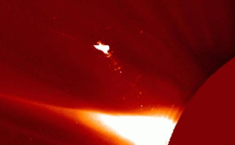 Телескопы LASCO зафиксировали необычное явление на фоне Солнца — объект, напоминающий гигантскую птицу или летательный аппарат с пламенным следом. По оценкам ученых, размер «крыльев» составляет около 150 тыс. км, а сам объект более чем в 10 раз превышает размеры Земли.