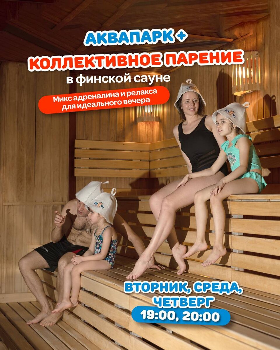 Прокатитесь на водных аттракционах, поплавайте в бассейнах, а после посетите коллективные парения в финской сауне нашего аквапарка🔥