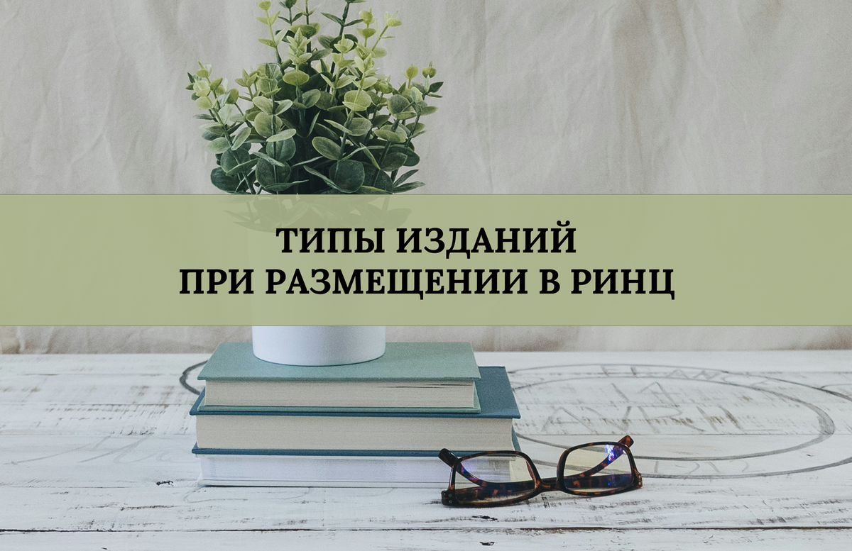 При размещении издания в РИНЦ в обязательном порядке требуется указать тип публикации. На выбор системой предоставляется несколько вариантов: Статья в журнале — это публикация в периодическом издании, содержащая результаты теоретических и/или экспериментальных исследований. Характеризуется прохождением рецензирования, наличием аннотации и ключевых слов, структурированным изложением материала. При этом, журнал, в котором размещена загружаемая в РИНЦ статья, должен быть зарегистрирован в РИНЦ. Книга — это самостоятельное печатное или электронное издание, представляющее собой законченный текст (или совокупность текстов), объединённый общей темой, идеей или авторским замыслом, оформленный в виде отдельного тома с определённой структурой (титульный лист, оглавление, главы и т. д.). Сборник статей — вид книги, в котором собраны отдельные научные, публицистические или литературные работы разных авторов (или одного автора), объединенные общей тематикой, проблематикой или целевой направленность