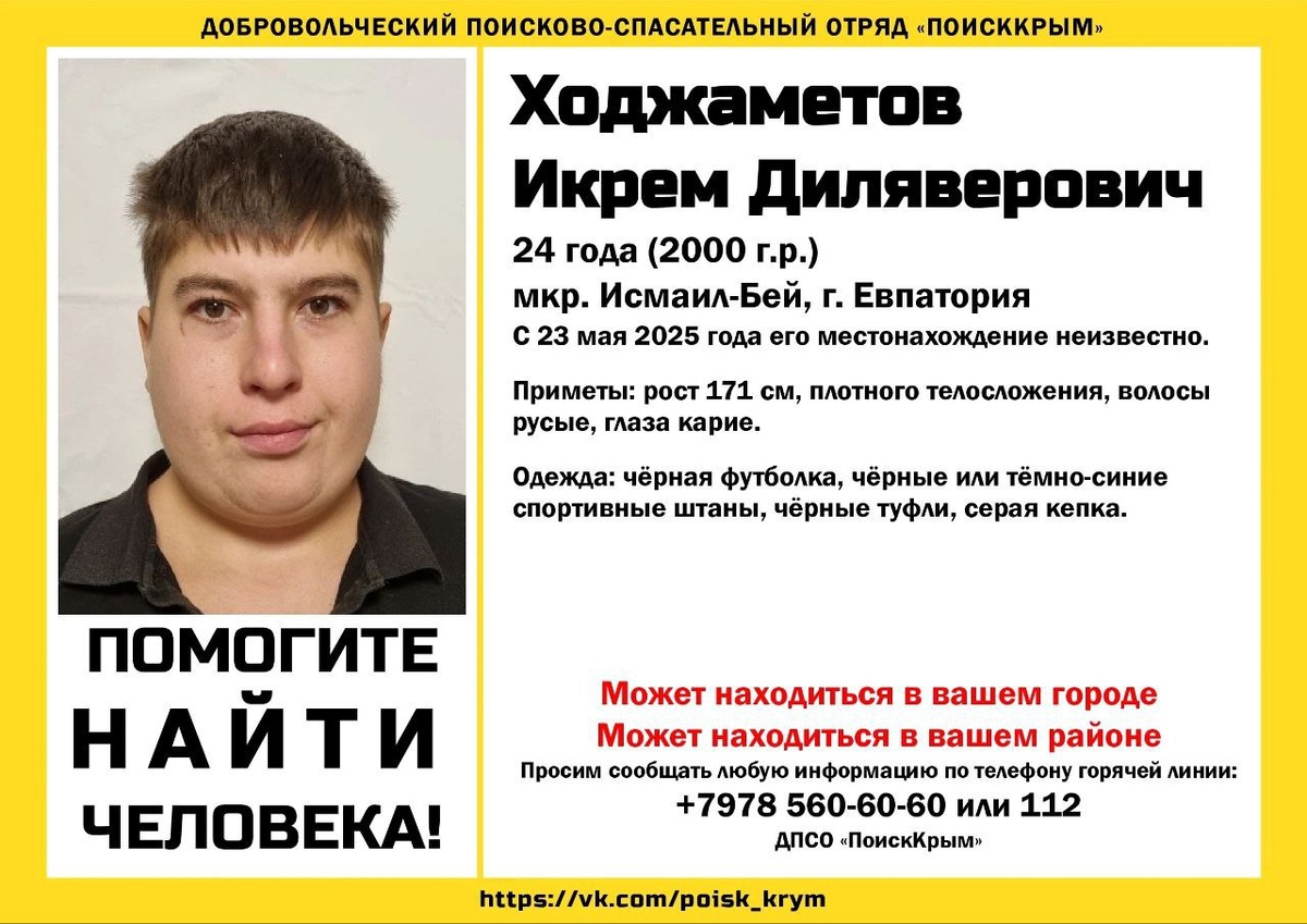В Евпатории в микрорайоне Исмаил-Бей ушёл из дома и не вернулся 24-летний Икрем Ходжаметов. По информации добровольческого поисково-спасательного отряда «ПОИСККРЫМ» молодого человека ищут с 23 мая.