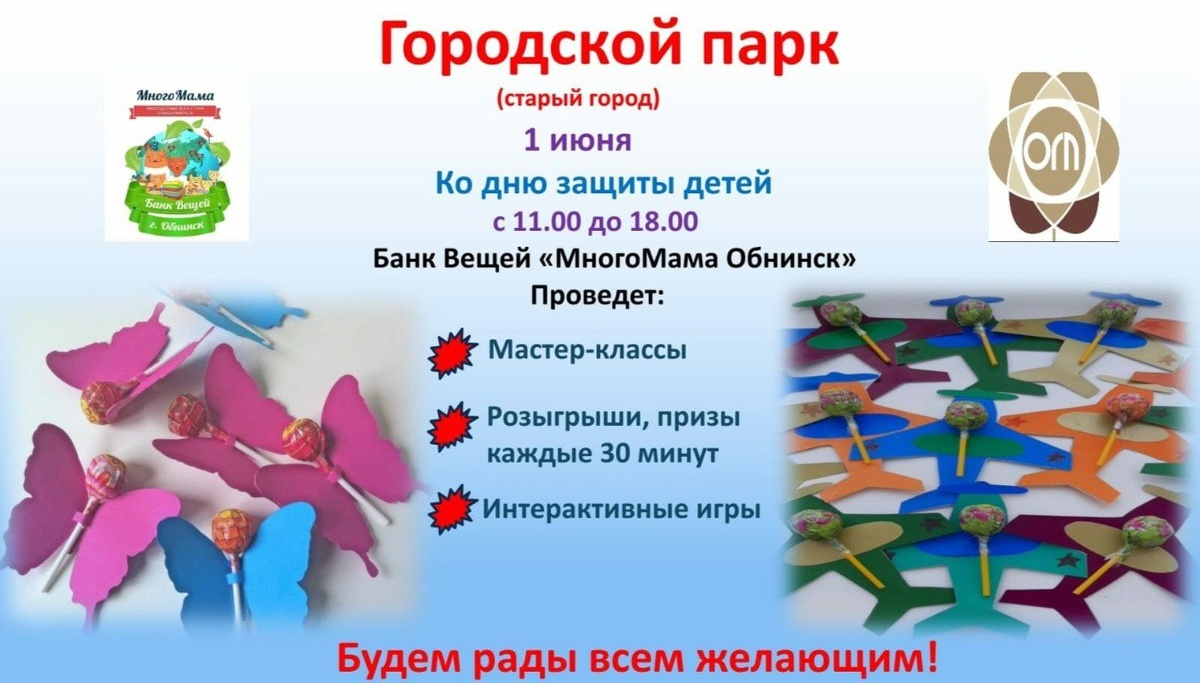 Программа праздничных мероприятий, посвящённых Международному дню защиты детей ☀ Детская школа искусств №1, ул. Жукова, 8 28 мая, 18:30 Праздничный концерт класса преподавателей И.В. Бирич и О.В. Медведевой ☀ Центр «Милосердие», пр. Ленина, 170 30 мая, 16:30 Праздник «Краски сказочного лета!». В программе: мастер-классы, аквагрим, подвижные игры, анимация и угощения ☀Детская школа искусств №2 им.Н.Метнера, ул. Энгельса, 22 30 мая, 17:00 IX Открытый региональный фестиваль «Оркестр и дети». Участники – учащиеся ДШИ Обнинска, Калуги, Калужской и Московской области ☀ Парк «Усадьба Белкино», ул. Борисоглебская 31 мая, 11:00 Традиционный семейный фестиваль «Forest games» ☀ Музей истории города, пр. Ленина, 128 1 июня, 10:00-18:00 День открытых дверей 1 июня, 13:00-14:00 Праздник «Творческое лето- 2025» для семей с детьми: - 13:00 Мастер-класс в технике акварельного скетчинга «Время – лето» - 14:00 Музейная игра «В поисках потерянного слова» Тематические и художественные выставки: - К 80