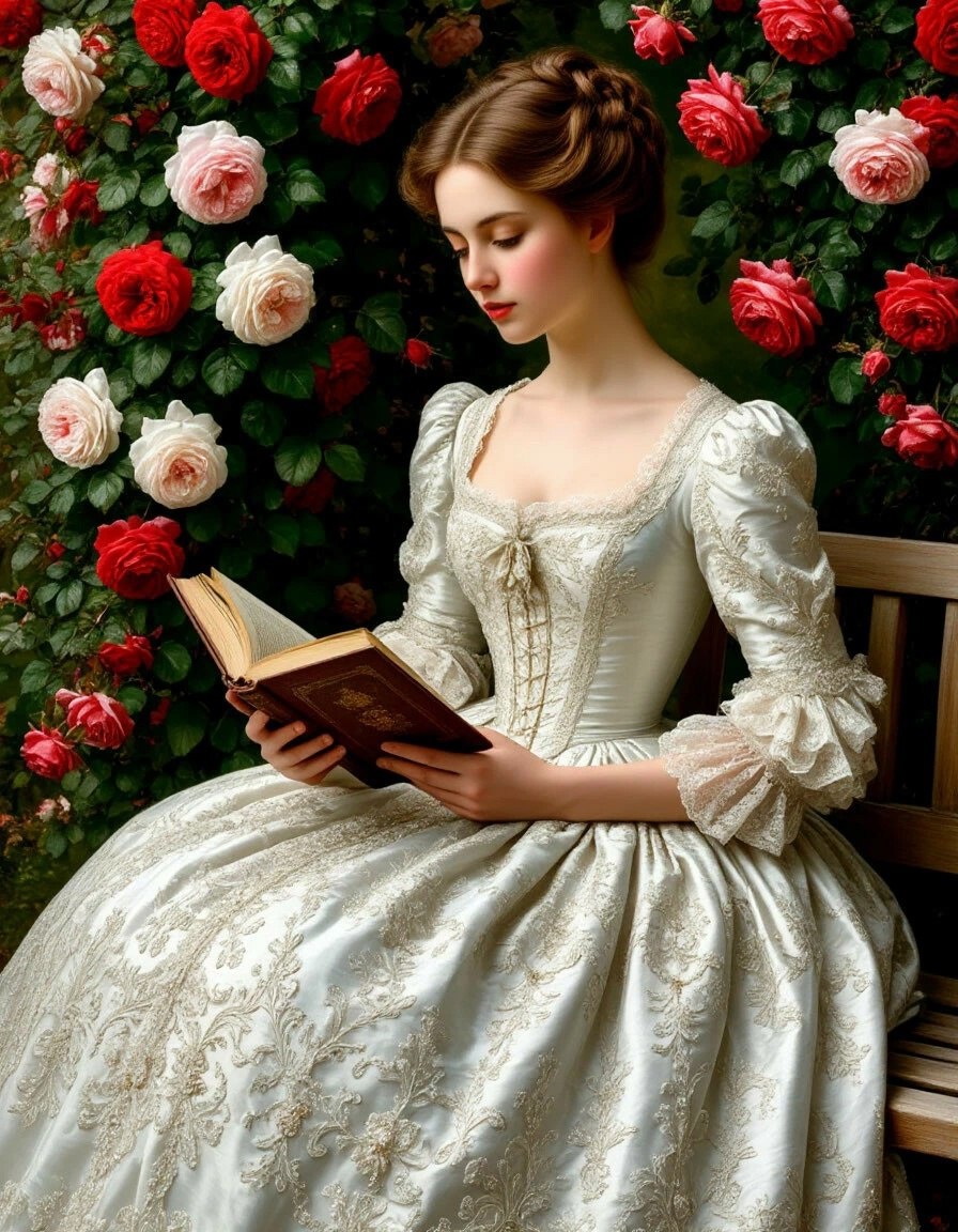 Прочитала вторую книгу за этот год. Теперь не знаю, что делать со своим чувством превосходства над другими 😀 A beautiful woman in a white lace dress sits on a bench reading a book. The scene is done in a rococo style reminiscent of old world aesthetics. The woman's long-sleeved dress with a puffy skirt is decorated with intricate embroidery and beading. The fine fabric drapes elegantly, conveying the vintage Victorian fashion of the era. The backdrop of a lush garden of red and white bush roses, highly detailed #neuroart #нейроарт #ai #ии #нейросеть #картинки #искусственныйинтеллект #цифровоеискусство #digitalart #арт #art #prompt #промпт #подсказка