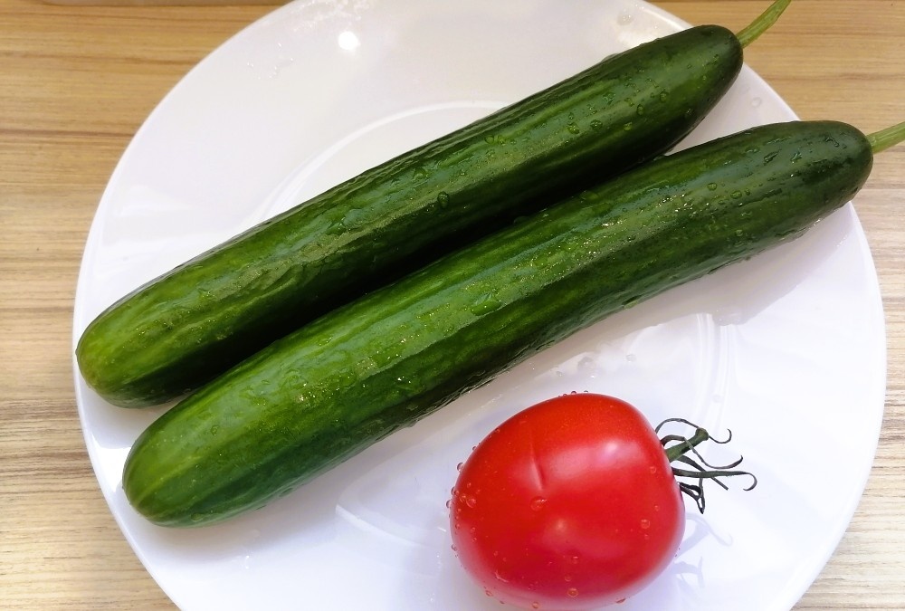 Обычно японские, китайские или корейские блюда предполагают тщательную и аккуратную нарезку продуктов, что требует от повара особого терпения, сноровки и определённых затрат времени, но «битые огурцы» приготовить совсем несложно. Набор продуктов – проще не бывает: два крупных огурца и один помидор, этого объёма достаточно для 3-х полноценных порций. Огурцы режем на четвертинки (если длинные – сначала пополам), затем обязательно присыпаем солью, укладываем в пластиковый пакет и завязываем. Теперь овощ нужно «побить»... Для этих целей использую небольшую сковородку, «побиваю» огурцы донышком, четвертинки должны стать более плоскими. Вынимаем огурцы из пакета, некоторые после «битья» могут распасться на части, может отделиться мякоть, как на фото. Ничего страшного, целые и «травмированные» четвертинки нарезаем наискосок брусочками среднего размера, отделившуюся мякоть тоже отправляем в салатник. Помидор сначала режем пополам, затем произвольно небольшими кусочками. П