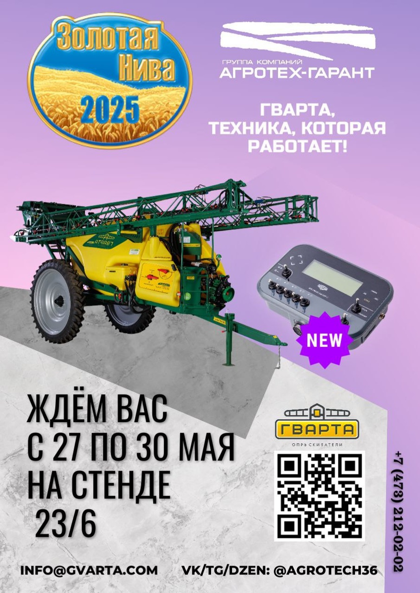 🚜 Уже сегодня на выставке «Золотая Нива 2025» в Краснодаре на стенде дилера ООО «АгроКапитал» (23/6) вы можете увидеть модернизированные модели сельскохозяйственной техники: опрыскиватель Гварта 8/24 с пофорсуночной подсветкой и компьютером Nova 100; обновлённую модель Гварта-4М с пневматической подвеской колёсной оси. Ждём всех на нашем стенде! Подписывайтесь на нас в VK, Дзен, Rutube, Nuum @gvarta36 в запретограмм