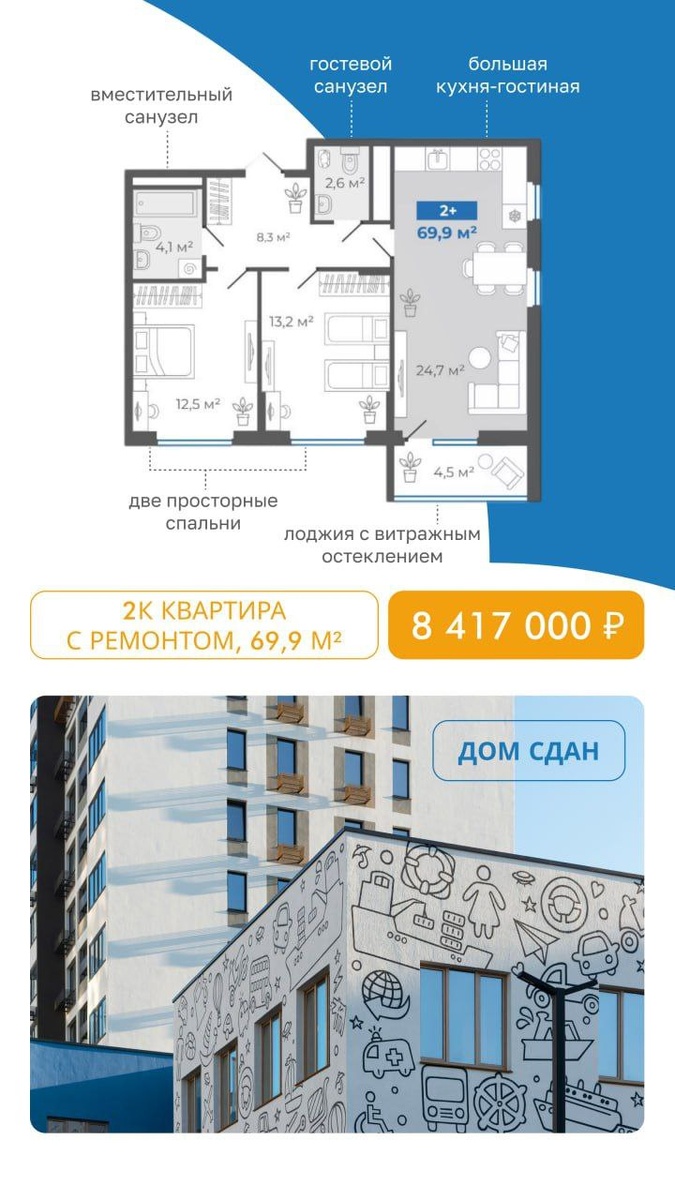 #ТЮМЕНЬ А со скидкой 7 911 980 ₽* 🔥 2К квартира с ремонтом в доме с детским садом во дворе! 69,9 кв.м., 2 этаж Дом сдан, ключи в день сделки! Скорей забирайте, пока другой не забронировал! *скидка применяется в случае покупки по Семейной ипотеке от СБЕР, ВТБ, ВБРР, Дом.РФ, Абсолют и за наличный расчет 📱89923566884 Алсу Рафисовна
