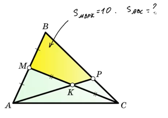 Рассмотрим решение задачи, которая на канале Валерия Казакова решена с помощью теоремы Фалеса. Задача дана под заголовком «Экзамен 9. Предложи свой способ!». Итак, задача. 1. В треугольнике ABC провели медиану CM. Продолжение медианы AK треугольника AMC пересекает BC в точке P. Найдите площадь треугольника ABC, если площадь четырёхугольника MBPK равна 10. Заключительный кадр решения выглядит так. Источник. Экзамен 9. Предложи свой способ! | Наглядная геометрия | Дзен Решения похожих задач мы уже разбирали на канале. Все они решаются одним и тем же приёмом. Решение. Проведём отрезок BK. Медиана KM делит треугольник ABK на два равновеликих треугольника, площади которых обозначим x. Медиана AK треугольника AMC делит его на два равновеликих треугольника, площади которых равны x. Площади треугольников AMC и BMC равны 2x, а треугольника ABC — 4x, её нам предстоит найти. Площади треугольников BKP и CKP равны соответственно 10 – x и 2x – 10. По свойству площадей S(ABK) : S(ACK) = S(BKP) : S(CK