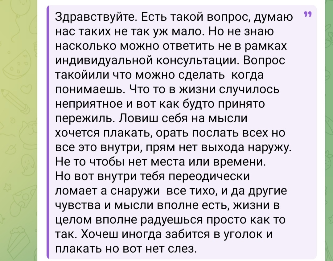 А это продолжение рубрики с ответами на вопросы, в том числе на анонимные. И вот очередной вопрос и ответ: Дать своему телу поорать, поплакать и всё прочее, кроме избыточной агрессии в адрес других. Агрессию можно на грушу, подушку, берёзку на пустыре, на топот, уничтожение макулатуры, чётко проговаривая, на кого и по какому поводу злость. Что бы с этим человеком сделали. (Это я в ответ на то, чтобы послать других). Можно почитать книгу Питера Левина «Пробуждение тигра». Она как раз про замершую в теле потребность орать и не только. Там есть упражнения. И там доступный язык. Это история про травматический опыт. Если плакать и выпускать запертое наружу не удаётся, помогают фильмы, музыка, книги, где есть возможность идентифицироваться с героем и прожить эмоцию с ним. Поплакать за себя и за того парня. Лучше всего, конечно, помогает быть услышанным и услышавшим в ответ на свою историю найденный в резонансе чувственный отклик другого. Потому что так-то многие чувства достаточно для нач