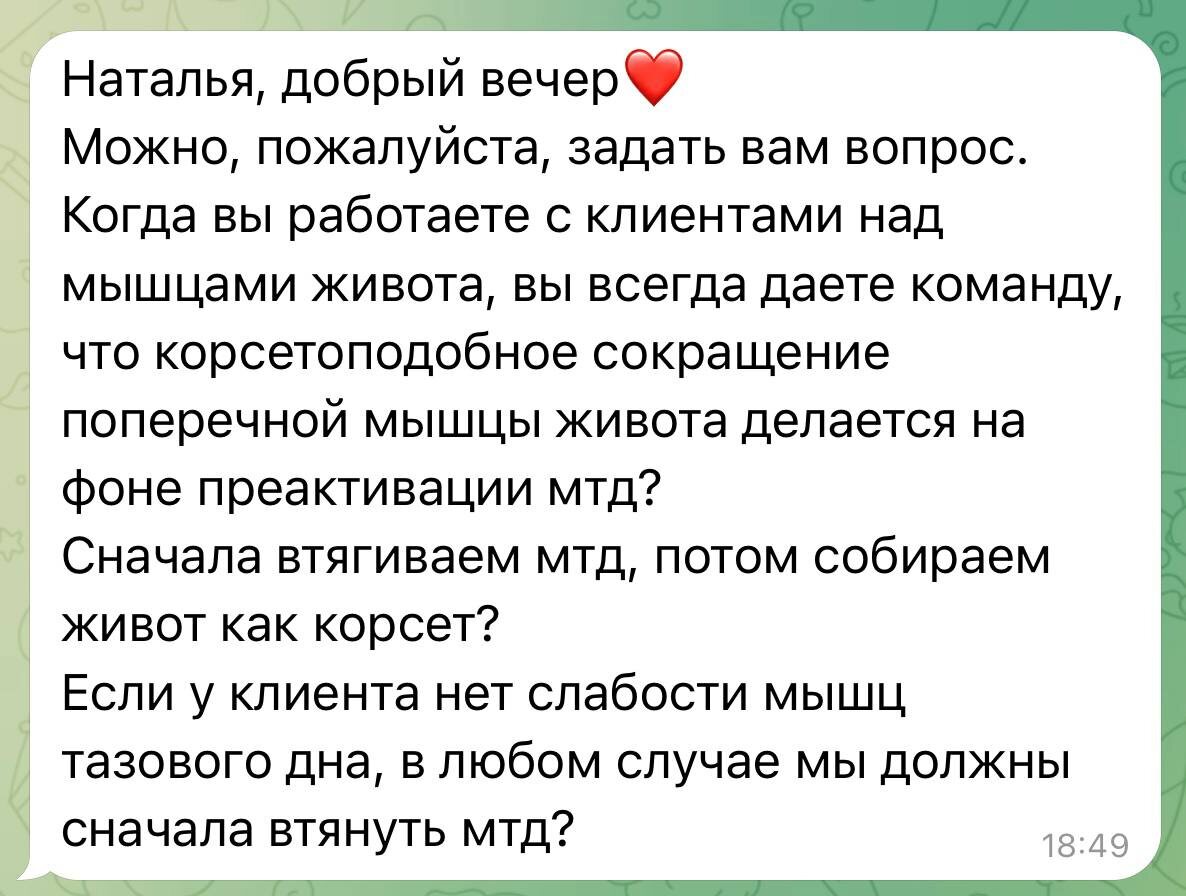 Достаточно распространенный вопрос от вас, а потому решила его озвучить здесь⬇️ «Наталья, добрый вечер❤️ Можно, пожалуйста, задать вам вопрос. Когда вы работаете с клиентами над мышцами живота, вы всегда даете команду, что корсетоподобное сокращение поперечной мышцы живота делается на фоне преактивации мтд? Сначала втягиваем мтд, потом собираем живот как корсет? Если у клиента нет слабости мышц тазового дна, в любом случае мы должны сначала втянуть мтд?» 💁🏼♀️Если проблем нет, то такой команды не даю. Слежу за внешними признаками дискоординации мышц, и если клиентка справляется, то продолжаем упражнения согласованно с дыханием. Мышцы внутреннего блока при хорошей межмышечной координации активируются автоматически до начала целевого движения. Специальных команд не требуется в данном случае. «Я теперь думаю, что делать, если раньше давала такие команды🤔 Но ведь, если есть проблемы с осанкой, то это уже говорит об отсутствии согласованной работы и правильного распределения ВБД?» 💁