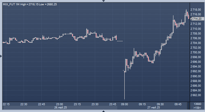 Инвесторы не верят в санкции График фьючерса на индекс Мосбиржи интервалами в 1 минут Российские акции открылись падением, которо было быстро выкуплено к 10 утра. По данным The Wall Street Journal, Трамп разочарован продолжающимися атаками на Украину и медленными темпами мирного урегулирования, поэтому размышляет над тем, чтобы ввести санкции в отношении России в ближайшее время. По словам источников издания, санкции вряд ли затронут банковский сектор, обсуждаются другие варианты давления на президента России Владимира Путина с целью вынудить его пойти на уступки за столом переговоров, в том числе на 30-дневное перемирие. Впрочем, как полагает собеседник WSJ, американский президент может решить не вводить новые санкции. Трамп подтвердил намерение отойти от попыток стран Евросоюза решить кризис на Украине посредством давления на Россию и расширением санкций, сообщил в понедельник журнал The New York Times (NYT) со ссылкой на источники. "Я не участвую", - по сути, так сказал Трамп", - пр