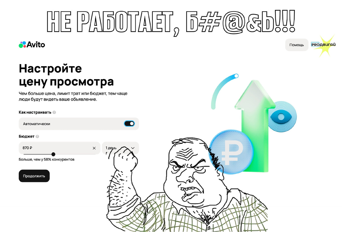 Другими словами - когда вы подключаете продвижение, Авито НЕ ГАРАНТИРУЕТ вашему объявлению просмотры, Авито дает показы.
