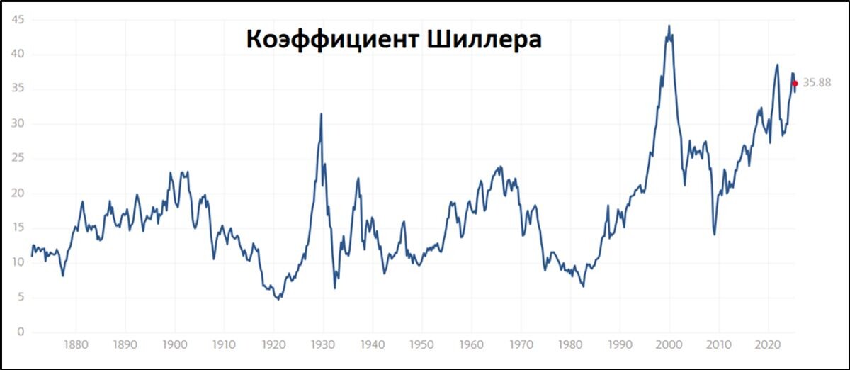 Коэффициент Шиллера (CAPE) базируется на соотношении текущей цены рынка (рыночной капитализации) к средней, скорректированной на инфляцию, прибыли за 10 лет. Другими словами, этот коэффициент уменьшает влияние инфляции на рост чистой прибыли компаний, входящих в индекс S&P 500.