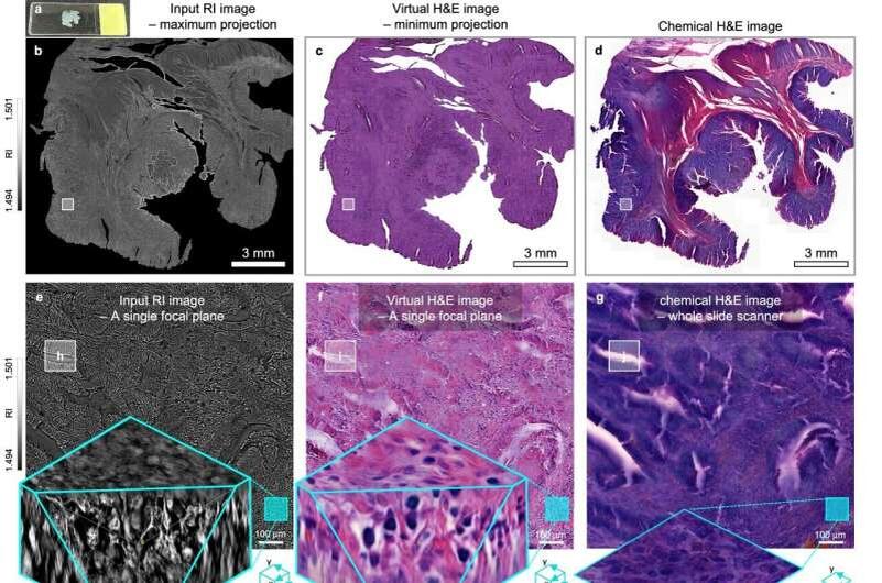 Международная команда ученых под руководством ЙонгКуна Парка (YongKeun Park) из KAIST (Korea Advanced Institute of Science and Technology) совместно с Су-Джин Шин (Su-Jin Shin) из Госпиталя Ганнам Северанс при Университете Ёнсе (Gangnam Severance Hospital, Yonsei University), Тэ Хюн Хваном (Tae Hyun Hwang) из Клиники Мэйо (Mayo Clinic) и AI-исследователями компании Tomocube разработала инновационную технологию. В основе метода — сочетание голотомографии (HT), оптической технологии для измерения 3D-структуры тканей, и алгоритмов глубокого обучения. Это позволяет создавать реалистичные изображения без физического окрашивания образцов. Исследование опубликовано в журнале «Nature Communications». Ученые смогли сгенерировать 3D-изображения, аналогичные классическим гистологическим срезам, окрашенным гематоксилином и эозином (синий — ядра клеток, розовый — цитоплазма). Технология показала высокую точность при анализе тканей разных органов, подтвердив универсальность метода. Эксперименты с об